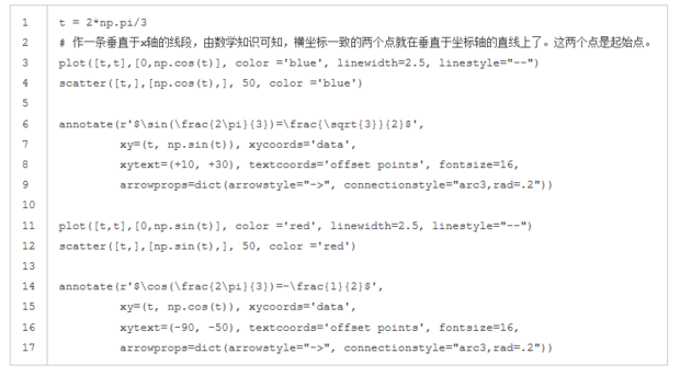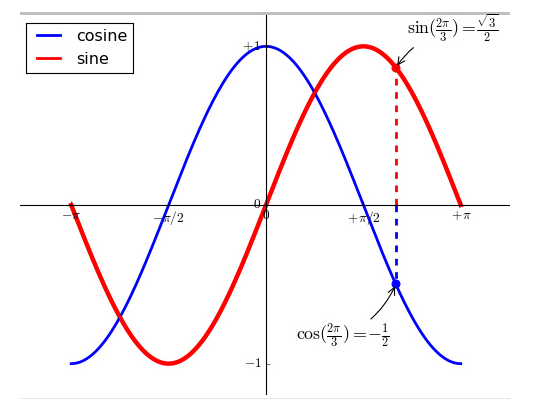 我们希望在 2π/32π/3 的位置给两条函数曲线加上一个注释。首先,我们在对应的函数图像位置上画一个点;然后,向横轴引一条垂线,以虚线标记;最后,写上标签。