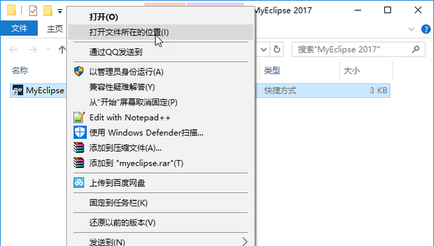 1.在开始菜单找到Myeclipse图标(博主是在win10中安装的),右键打开文件所在位置,发现只是一个快捷方式,继续右键打开文件所在位置,这时便找到Myeclipse安装所在位置(安装在其他盘的请直接找到安装位置)