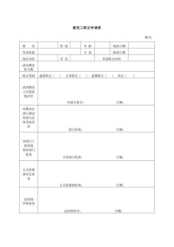 新员工转正申请表(模板)
