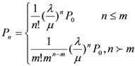 多通道就是服务台。对于这种排队问题只讨论标准模型,其特征与单通道标准模型特征完全相同。假定有 m 个服务台,每个服务台相互独立工作,平均服务个数相同,则整个服务机构的平均服务率为 m μ,显然只有当λ /m μ <1 时才不会排成无限长的队列,下面不加证明的给出稳定状态概率 P n 和系统指标。