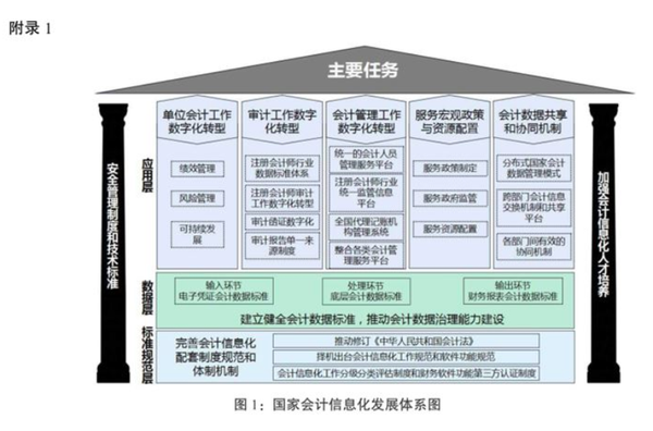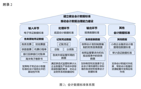 ——会计数据标准体系基本建立。结合国内外会计行业发展经验以及我国会计数字化转型需要,会同相关部门逐步建立健全覆盖会计信息系统输入、处理、输出等各环节的会计数据标准,形成较为完整的会计数据标准体系。