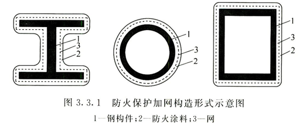3. 3. 3 下列钢结构,若不能提供相应尺寸构件的防火涂料型式检验报告或型式试验报告 ,应在非膨胀型钢结构防火涂料涂层 内加网施 工 :