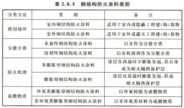 2. 0. 5 本条规定了钢结构防火涂料 的分类 , 以便 于设计 、施工时的选型。 环氧类钢结构防火涂料属于膨胀型钢结构 防火涂料 , 因此将膨胀型钢结构防火涂料分为环氧类膨胀型钢结构防火涂料和非环氧类膨胀型钢结构防火涂料。