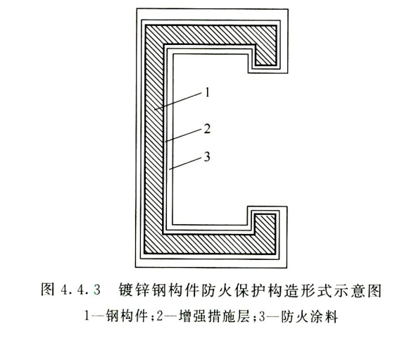 4. 4. 3 镀锌构件表面光滑 , 防火涂料不容易附着在镀锌层上 ,在涂装防火涂料前 ,需要在镀锌钢构件表面采取涂刷环氧磷酸锌等措施 , 以增强镀锌层与防火涂层的附着力 。