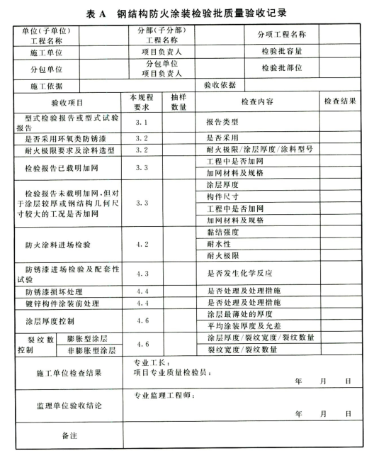 5. 2. 1 防火涂装分项工程所含各检验批质量验收记录,应按本规程附录 A 填写。