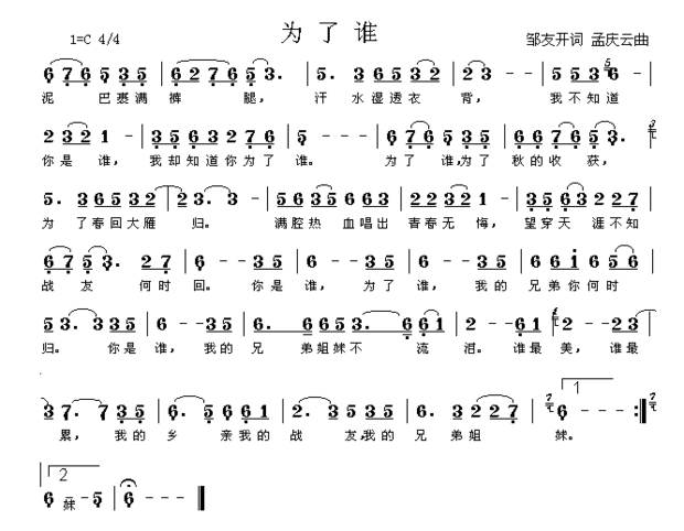 轩轩小姐姐2019-04-27原创《为了谁》,邹友开作词,孟庆云作曲,由祖海原唱。此词曲昭示着人们,生命当珍重,大爱铸青春,堪称一首经典红歌。