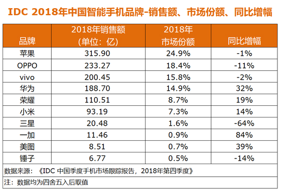 在销售额方面,苹果、OPPO、vivo、华为、荣耀占据前五名,市场份额之和超80%,但仅华为、荣耀实现了销售额的同比正增长。小米以93.19亿美元排名第六,三星、一加、美图、锤子手机同时跻身TOP10。